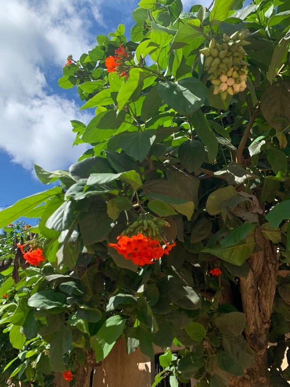 - Ses inflorescences, aux fleurs ayant un calice tubulaire et campanulé, ont un parfum agréable à sentir. Elles sont de couleur rouge orangé brillant. Leur nombre de pétales varie, comme celui de leurs étamines, de 5 à 7. Elles ont deux styles bifides.