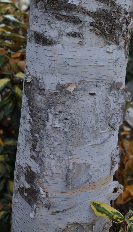 - Son écorce lisse et d'une couleur blanche cireuse (couleur due à la bétuline, un polymère résineux) est striée de noir et se renouvelle constamment, s'exfolie en lamelles horizontales et avec le temps s'obscurcit et s'épaissit à la base du tronc.