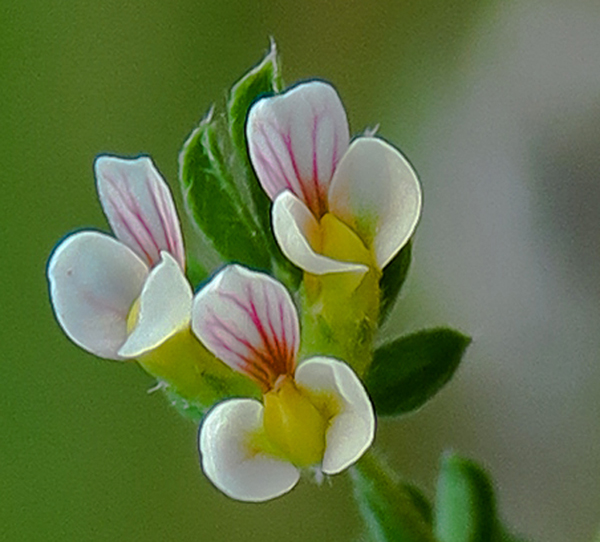 - Ses très petites fleurs ont un calice velu à 5 dents. Au nombre de 2 à 7 par inflorescence, elles sont d'un rose très pâle mais avec un étendard strié d'un rose franc et une carène dorée.