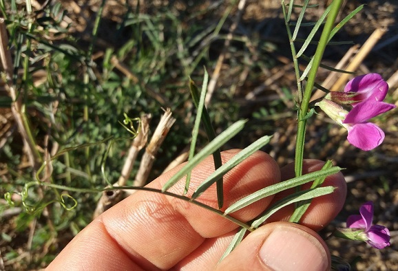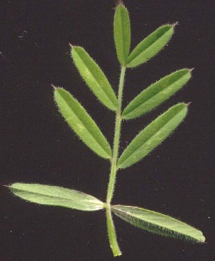 - Sa feuille, présentant une petite stipule (comme c'est le cas dans ce genre de plante) sous laquelle se trouvent des nectaires noirâtres attirant les fourmis, est composée, avec 3 à 8 paires de folioles spatulées et à extrêmité pointue, la terminale avec couramment une vrille ramifiée, mais pas toujours.